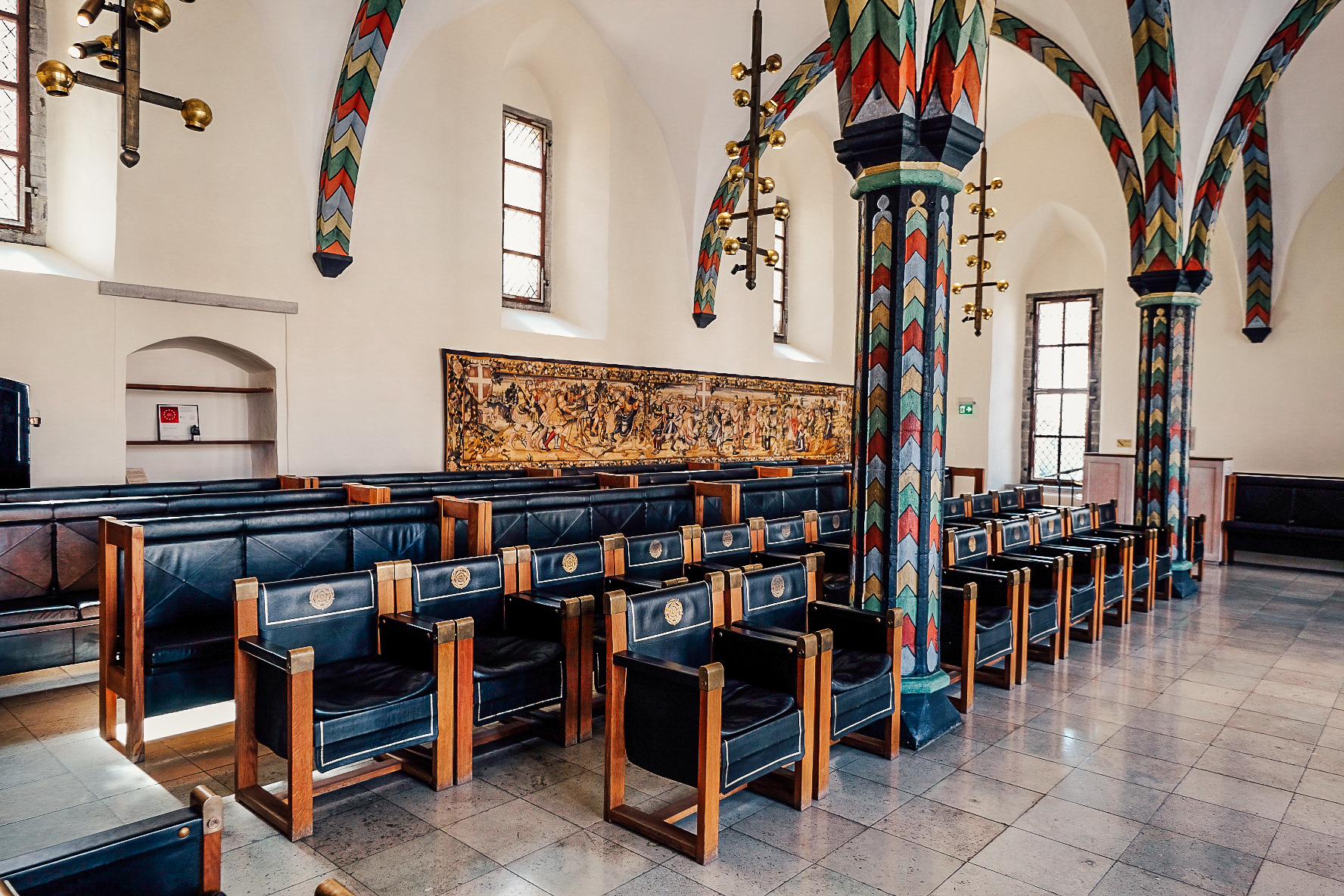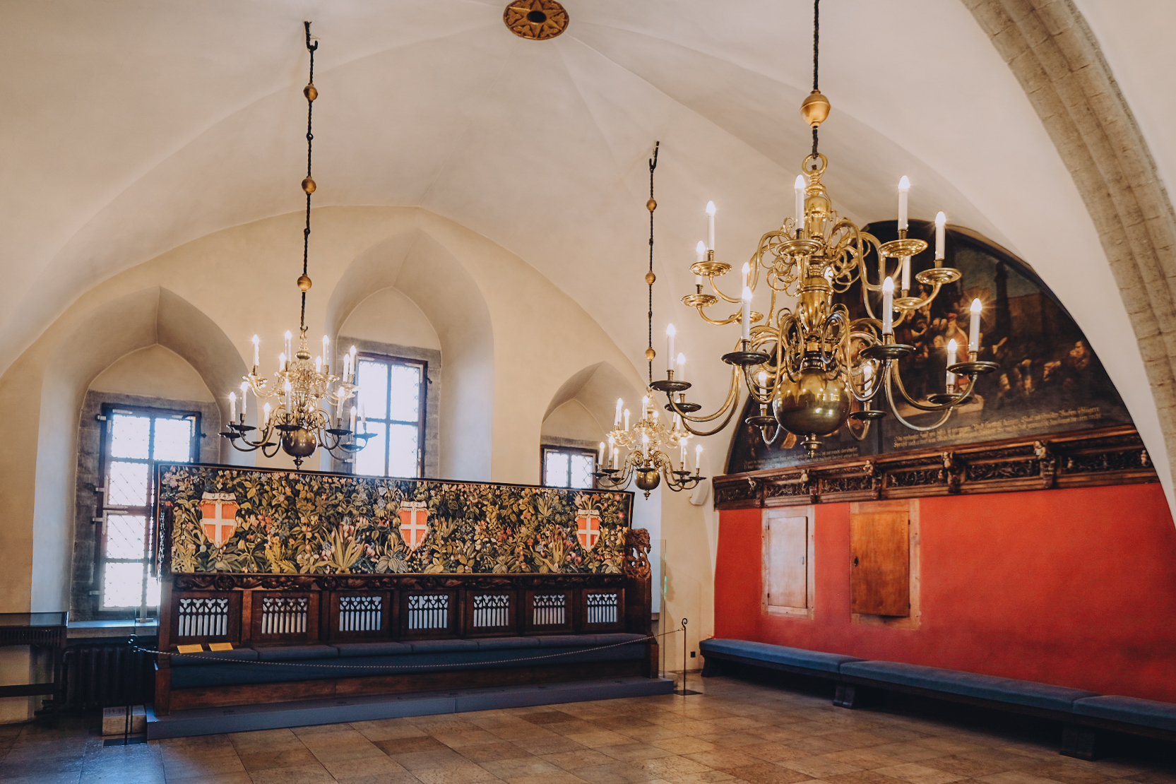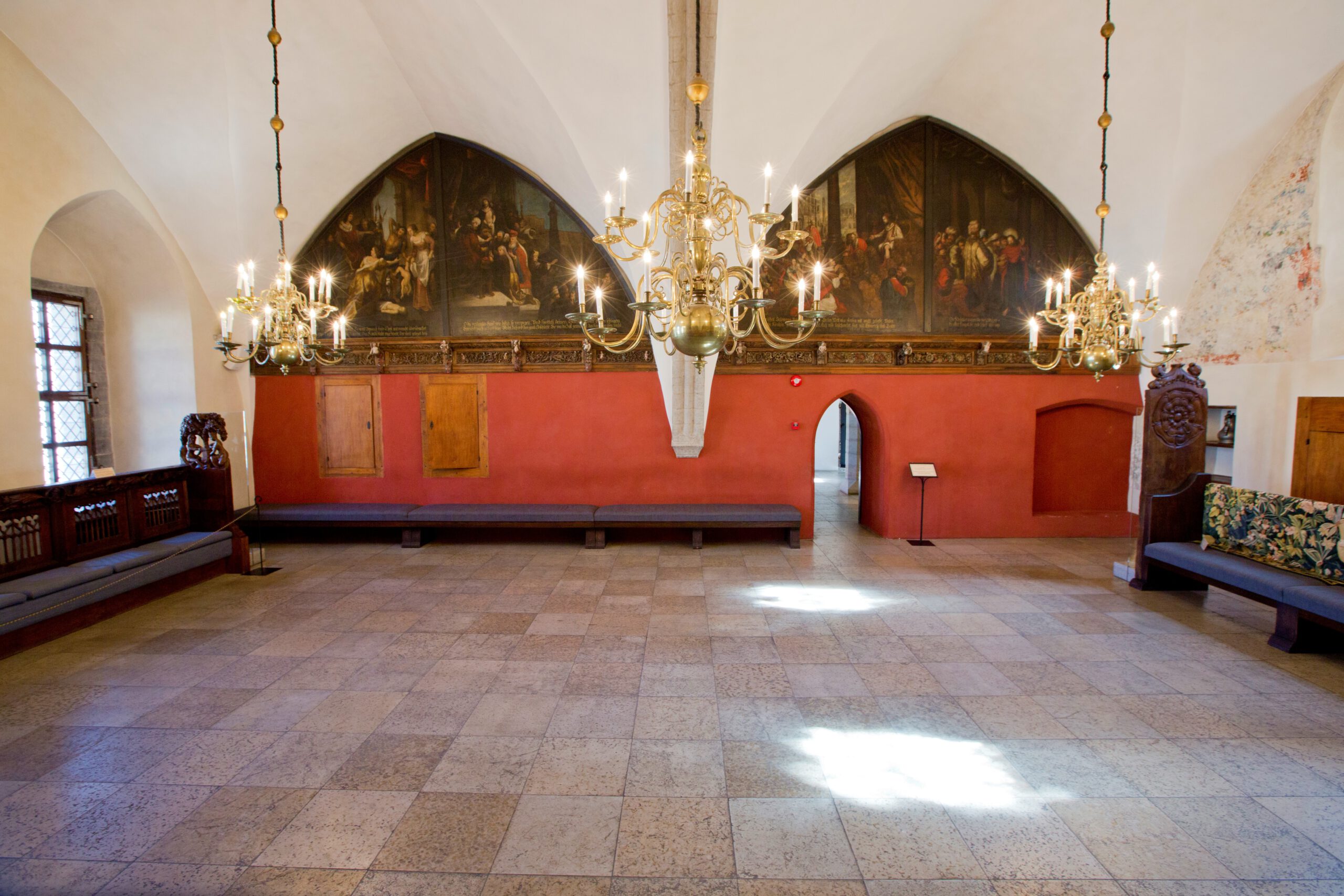 The Council Chamber is famous for its unique art values (14th–15th century benches, 16th century wall paintings, 17th century lunette paintings, carved friezes, chandeliers etc.) which impose strict restrictions on the events held in the room. For a stand-up reception, the Council Chamber accommodates 80 people.
