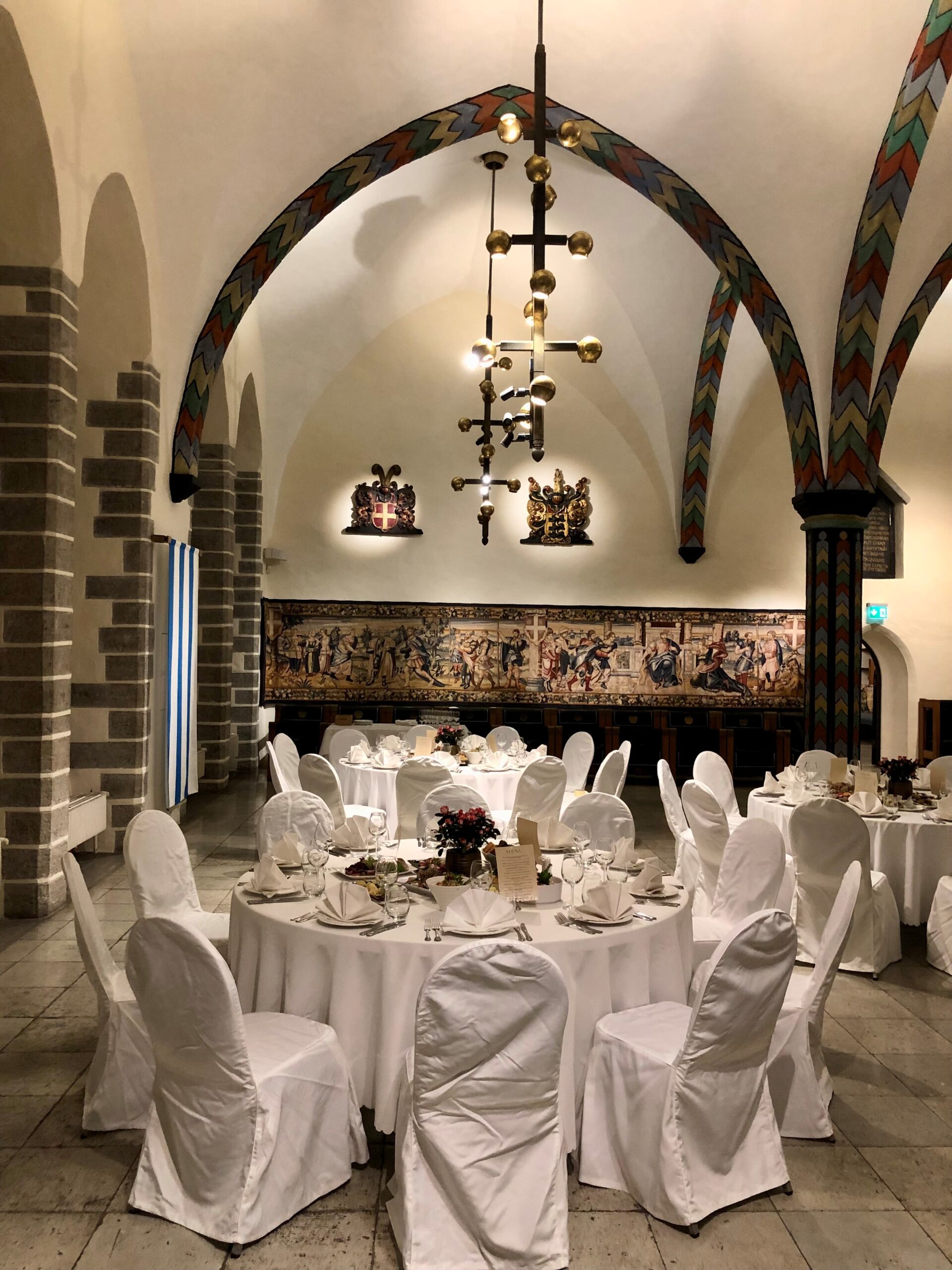 A catering company ordered by the organiser may set up a fingerfood or forkfood buffet-table in middle of the Council Chamber. Please remember that at all food needs to be eaten one-handed or with fork only.